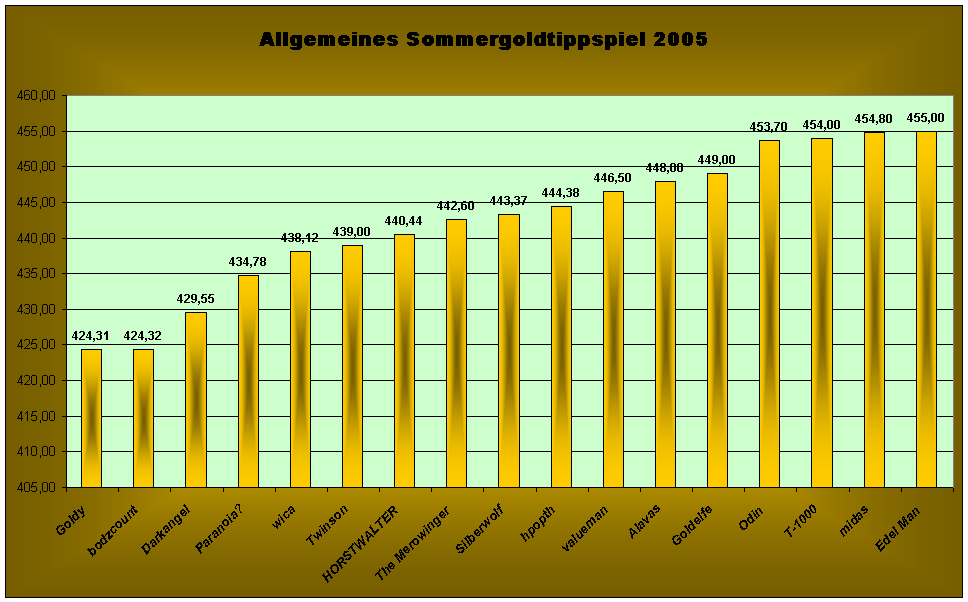 Die Auswertung erfolgt zum 01.Oktober 2005 hier in diesem Thread. Tippabgabe ist bis Montag den 08.08.2005 23:59 möglich