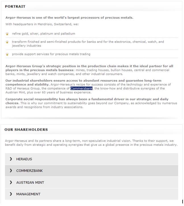 EDIT: ... und auf http://www.goldbarsworldwide.com habe ich gefunden, dass die Commerzbank 26,5% an Argor Hereaus hält (pdf)