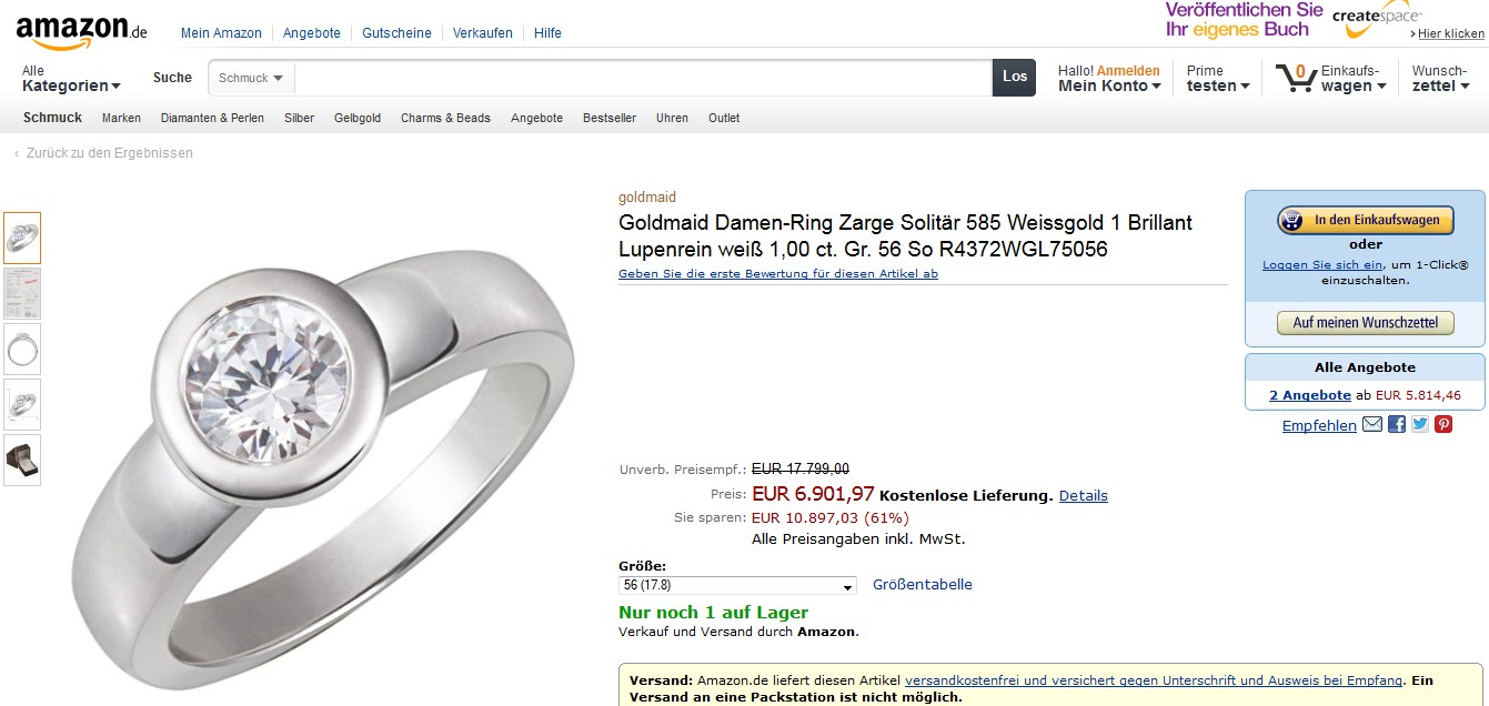 Ob Amazon selbst Edelmetallanbieter werden könnte? Zutrauen würde ich es denen. Die Logistik dürfte kein Problem darstellen. Schmuck wird ja auch schon angeboten, allerdings wird der ganz teure Schmuck nie von Amazon selbst verschickt. Bei Ringen geht das bis 85.000 EUR, die dann von den Anbietern selbst versendet werden. Ich musste ziemlich lange suchen, um einen Ring zu finden der von Amazon selbst verschickt wird, immerhin knapp 6.900,- EUR.