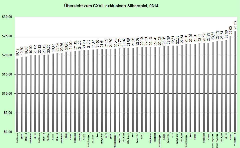 - Gewinner unseres Spieles wird der Silberspieler sein, dessen Tipp zum letzen Handelstag des Spielmonats, dem tatsächlichen Silberkurs zu diesem Zeitpunkt am besten entspricht. Es gilt der Globex-Schlusskurs NY in US-$ 22:30 MEZ.