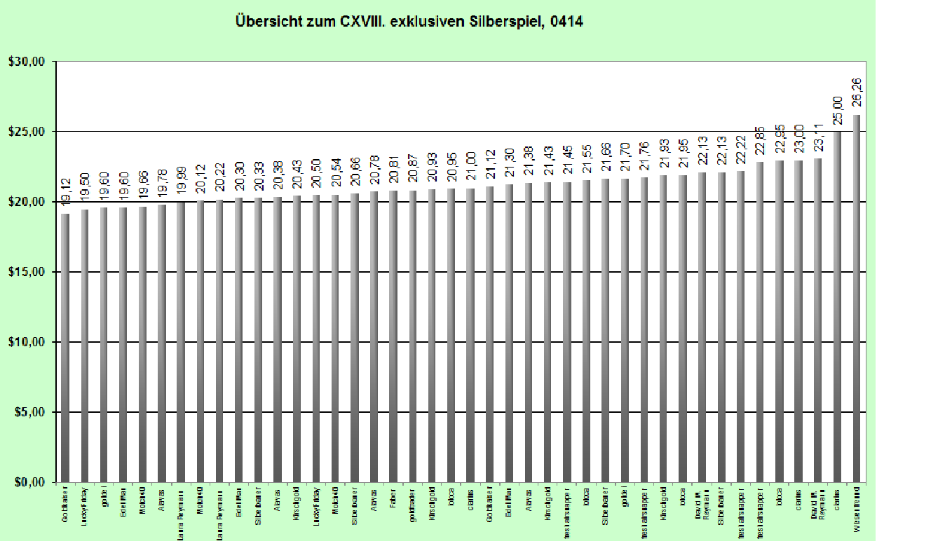 - Gewinner unseres Spieles wird der Silberspieler sein, dessen Tipp zum letzen Handelstag des Spielmonats, dem tatsächlichen Silberkurs zu diesem Zeitpunkt am besten entspricht. Es gilt der Globex-Schlusskurs NY in US-$ 22:30 MEZ.