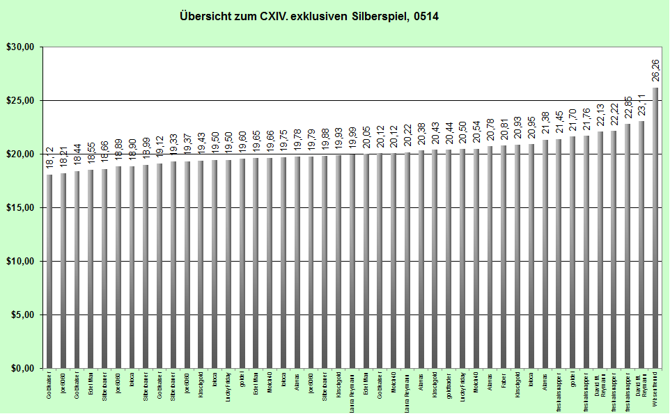 - Gewinner unseres Spieles wird der Silberspieler sein, dessen Tipp zum letzen Handelstag des Spielmonats, dem tatsächlichen Silberkurs zu diesem Zeitpunkt am besten entspricht. Es gilt der Globex-Schlusskurs NY in US-$ 22:30 MEZ.