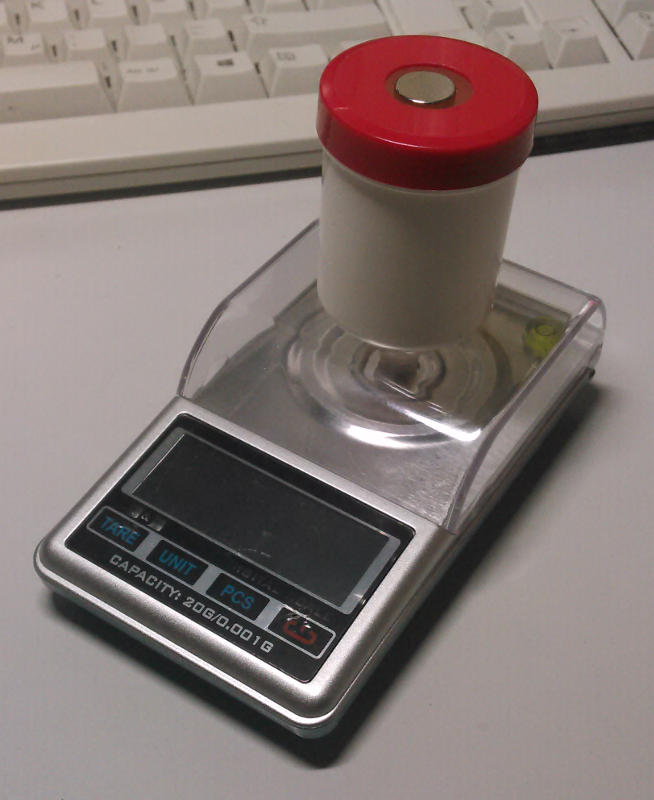Als Magnet habe ich da einen Magnet mit ca. 12mm Durchmesser, weil ich meinen zweiten mit 15mm grad nicht finde. Das angezeigte Gewicht ist etwa drei Viertel vom 15mm-Magnet.