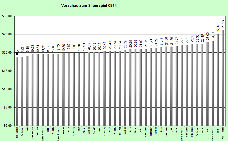- Es gibt einen Topptipperbonus, der in jeder Runde in der es keinen Cent genauen Tipp gibt vom Spielpartner erweitert wird. Im Falle des exakten Tipps wird dieser Bonus dem treffenden Silberspieler zugeschlagen bzw. zwischen Gleichen geteilt.