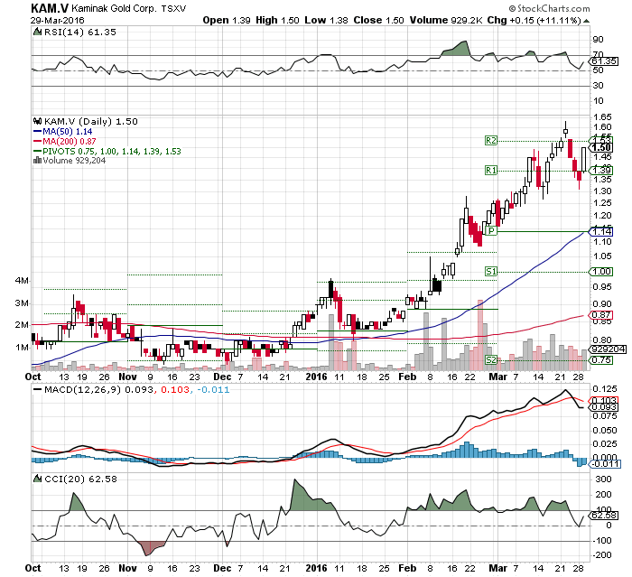 Bingo. Das war im Januar, gestern 1,59 C$. KAM ist eine feine Aktie. Habe sie bereits zuvor in 2 Tranchen, zuerst 20 % , zuletzt 25 % Ende Februar erleichtert, ist aber immer noch mit 7,2 % im Depot ordentlich gewichtet, bleibt dort als FL.