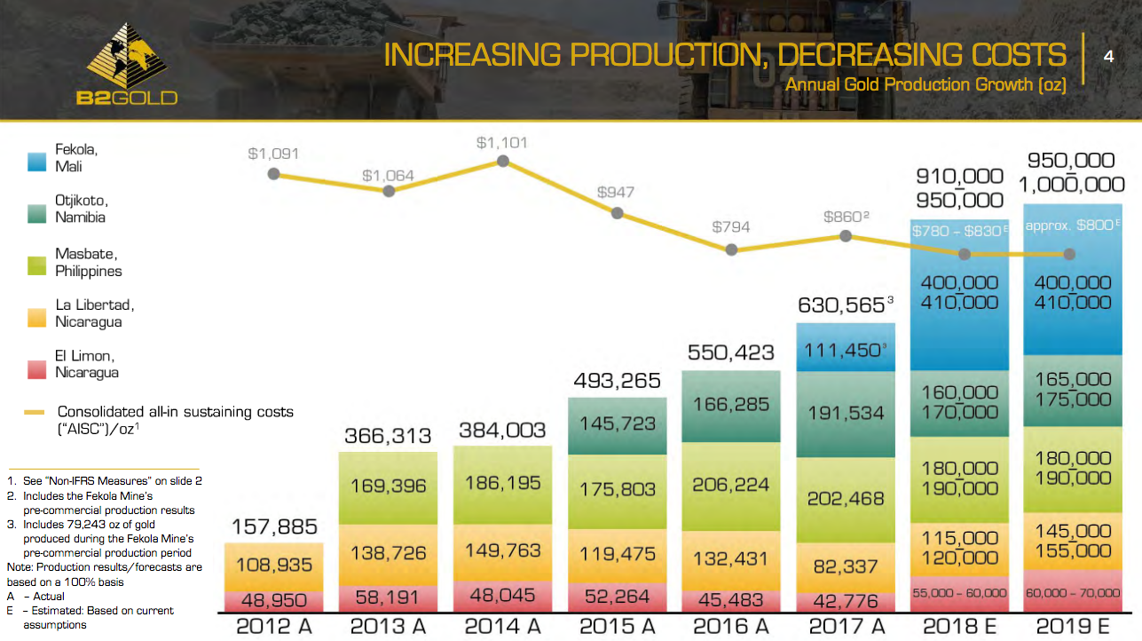 - B2Gold is well on target to achieve transformational growth in 2018 and meet its annual guidance of between 910,000 and 950,000 ounces of gold production in 2018 at cash operating costs (see “Non-IFRS Measures”) of between $505 and $550 per ounce and all-in sustaining costs (“AISC”) (see “Non-IFRS Measures”) of between $780 and $830 per ounce