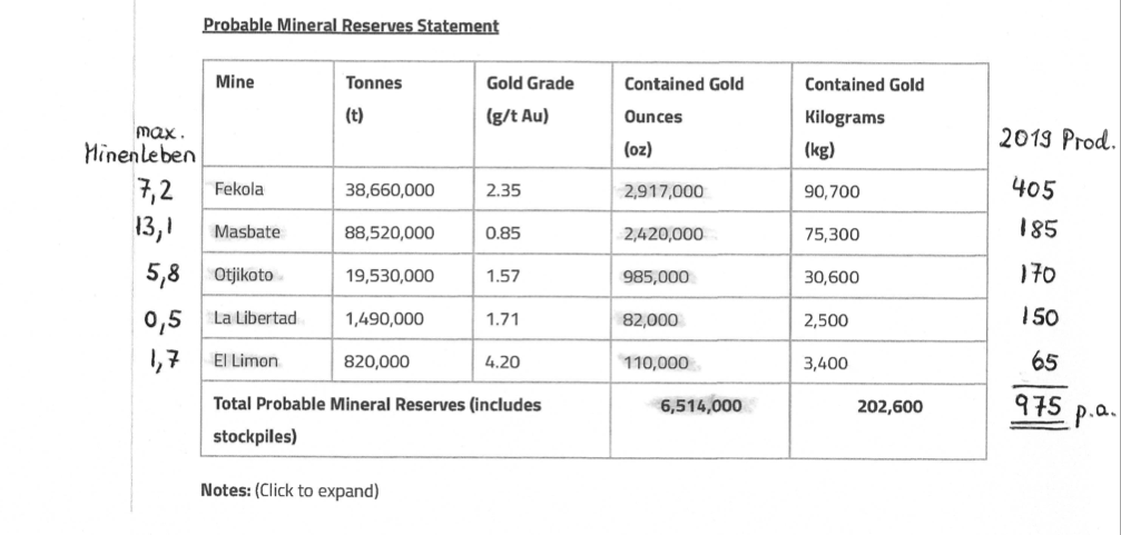 Die einzige Mine, die die ausgewiesene 2019er Jahresproduktion über 10 Jahre aufrecht erhalten kann, ist die Masbate Mine auf den Philippinen. Bei Fekola (Mali), dem Flagschiff, sind es schon nur noch 7,2 Jahre, bei Otjikoto (Namibia) nur 5,8 Jahre und bei den zwei Minen in Nicaragua sind es lediglich noch 0,5 Jahre (!!) und 1,7 Jahre Restlaufzeit auf Reservenbasis. (!!)