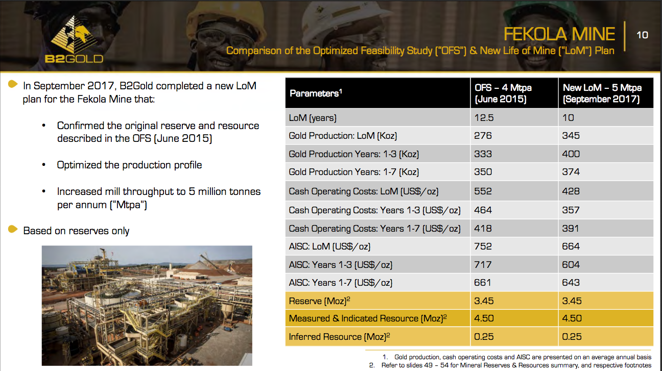 The Fekola Mine is the Company's largest and lowest-cost producer. The resulting increase in production levels combined with low costs are projected to dramatically increase B2Gold's production, revenues, cash from operations and cash flow for many years, based on current assumptions (including a gold price assumption of $1,300 per ounce). On average over the next three years, beginning in 2018, the Company is projecting per annum gold sales revenues of approximately $1.2 billion, cash flow from operations of approximately $0.5 billion and a significant increase in free cash flow (operating cash flows less investing cash flows).