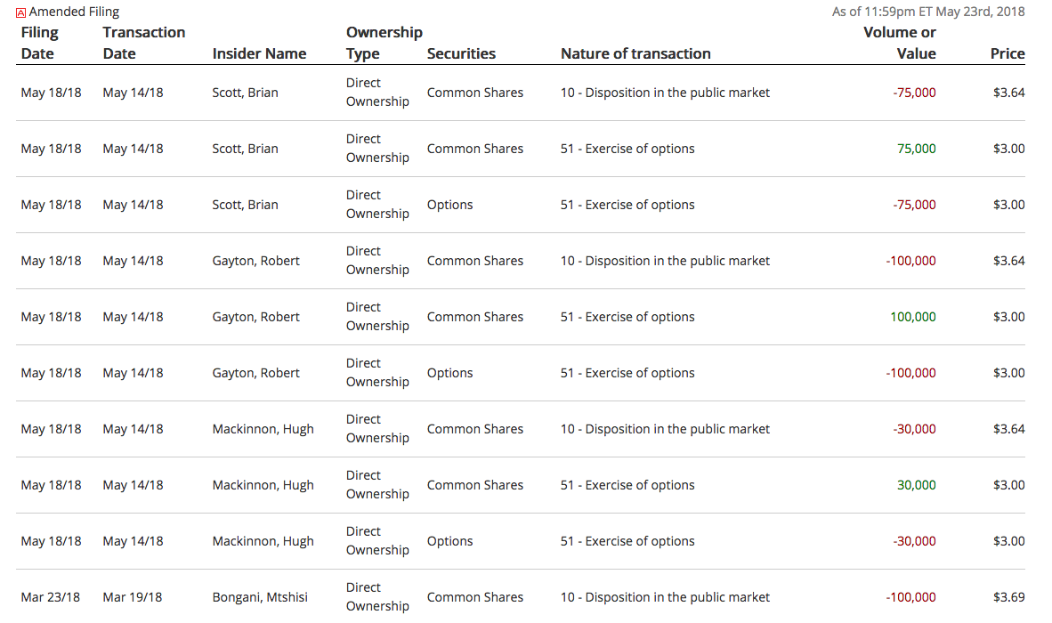Aber wieso wurden allein im Mai 2018 schon wieder eigene Aktien im Wert von 750.000 C$ direkt verkauft und zusätzlich noch Optionen im Gegenwert von 615.000 C$ verramscht? (bzw. gehören die Optionen und die Insiderverkäufe auch zusammen)