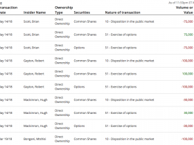 Doch es wurden mit Filing date Juli 2018 bereits wieder eigene Aktien im Gegenwert von ca. 3.745.222 C$ verkauft. (Die Transaktionen waren jedoch teilweise auch bereits deutlich vor Juli 2018)