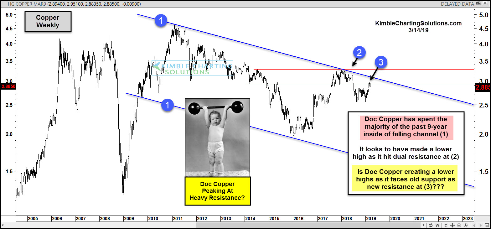 Doc Copper has created a series of lower highs and lower lows over the past 9-years inside of falling channel (1).