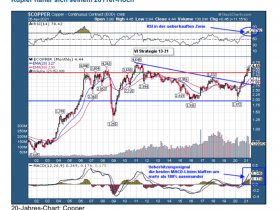 Kupfer kann kurzfristig sein 2011er-Hoch testen und sogar darüber steigen. Aufgrund der überhitzen markttechnischen Lage (MACD) und der CoTs ist aber nicht davon auszugehen, dass sich der Preisanstieg ohne nennenswerte Korrektur fortsetzen wird. Dies wiederum korreliert mit den vorsichtigen Ausblicken auf die Wall Street. Noch sind die Aufwärtstrends alle intakt. Dies schließt aber eine spürbare Korrektur in bereits naher Zukunft nicht aus.