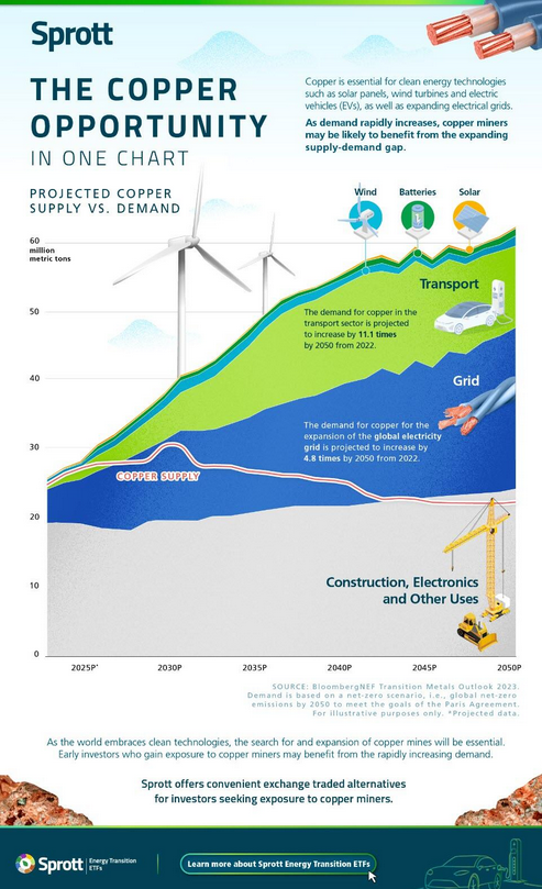 Die üblichen Berechnungen gehen von steigender Nachfrage und sinkender Produktion aus, sodass eine zunehmende Lücke zwischen Angebot und Bedarf entsteht, die den Kupferpreis in die Höhe treibt.