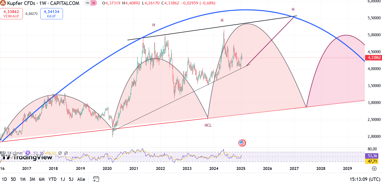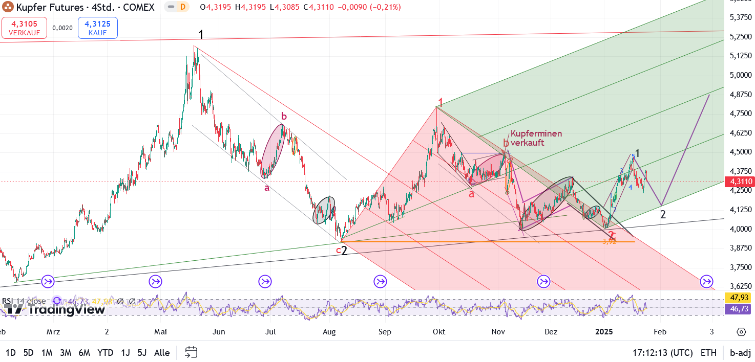 Ähnlich wie bei Gold ist bei Kupfer nicht klar ob es eine "klassische ABC Korrektur" (rot) oder ein Dreieck mit einer ABCDE (orange) wird.