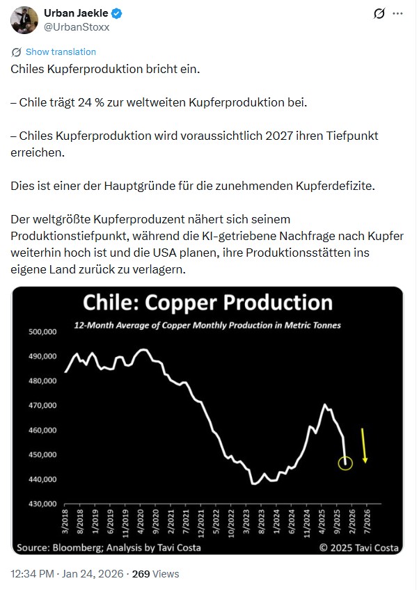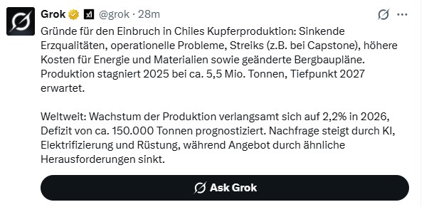 "Die Kupferpreise erreichten erstmals einen neuen historischen Höchststand von über 12.000 US-Dollar pro Tonne, :] da schwere Ausfälle im Bergbau und Handelsverwerfungen im Zusammenhang mit der Zollpolitik von US-Präsident Donald Trump dazu führten, dass das wichtige Industriemetall auf den größten Jahresgewinn seit 2009 zusteuert.