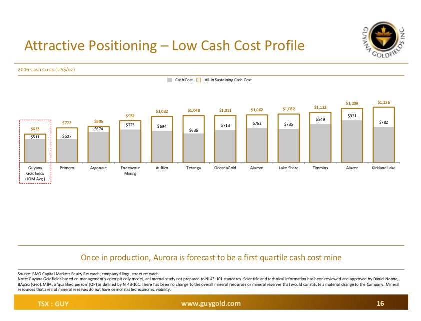 Mit "exzellenter Entwickler" ist Guyana Goldfields gemeint, das ist aber doch klar. Die Prognosen, besser gesagt Erwartungen / Vermutungen (we expect) 1200 - 1400 des Verfassers sind irrelevant, er rechnet, wie ich weit zuvor erwähnte, daß GUY noch bei 1000 $ / oz wirtschaftlich sei, das ist wichtig.