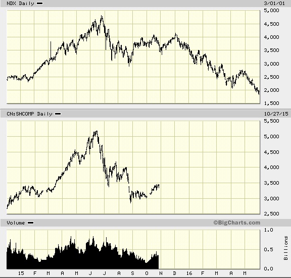 Ja, und die platzt eben gerade, diese Bubble. Man sieht es ja auch an dem massiven Abwärtsdruck auf den Shanghai Composite im Vergleich zur Nasdaq 2000 unten; trotz der gigantischen Stützungsmaßnahmen durch die chinesische Regierung, wohlgemerkt!