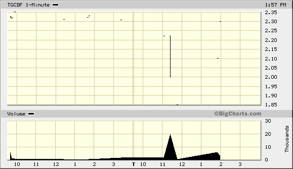 Zu Handelsbeginn je ein Kauf mit 1000 bzw. 500 Stücken zu 0,64 C$, der überwiegende Handel zu 0,58 C$ und am Schluss noch ein Trade zu 0,61 C$ über 500 Stücke.