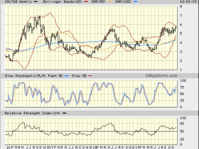 Ein längerfristiger Chart sieht auch gut aus. Das stark verengende Bollingerband wird stets verlassen, oftmals mit starkem Ausbruch, hier nach oben...