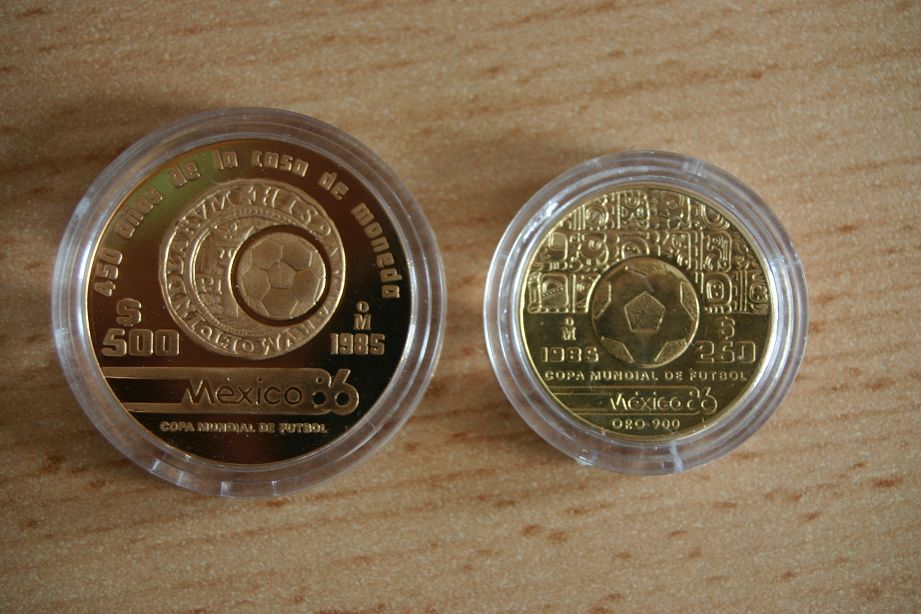 250 Pesos Mexiko WM 1986 in PP (Auflage 4.506 Stk) mit 8,64 Gramm 900er Gold (1/4 Unze fein) -> Preis 128 EUR