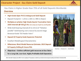 Fifteen drill holes were completed over a 700-metre-long corridor, which coincides with an Induced Polarization ("IP") chargeability high and a resistivity low, south of Clovis Lake. This anomaly occurs within felsic volcaniclastic rocks containing graphite and pyrrhotite, flanked by mafic volcanic rocks and quartz-feldspar porphyry. Anomalous gold ranging from 0.20 to 17.8 grams per tonne gold (g/t Au) was intersected in 13 of 15 drill holes over intervals from 0.5 to 16.0 metres. Drill hole 538 intersected a 6.5-metre-wide interval of altered mafic volcanic rock, which assayed 1.72 g/t Au, including a 0.5-metre-wide quartz-tourmaline vein grading 17.8 g/t Au. 21 intercepts exceed current potential open pit cut-off grades at Eau Claire, while seven exceed current potential underground cut-off grades (NR Oct 11, 2012), with intervals ranging from 14.15 g/t over one metre to 17.80 g/t over a half metre (see website for drill plan and table).