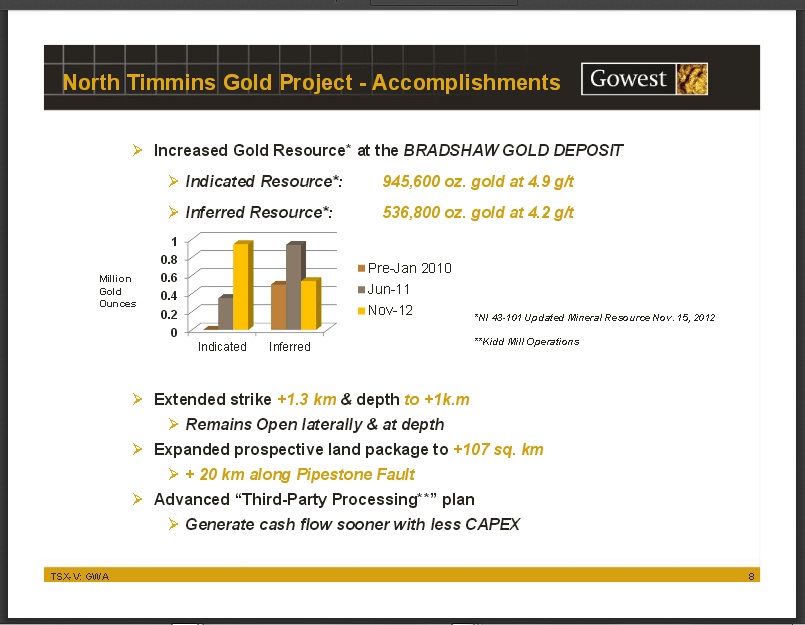 ZitatGowest Gold Ltd. is a Canadian gold company focused on fast-tracking the development of its 100% owned, Bradshaw Gold Deposit (“Bradshaw”) (formerly named Frankfield East), part of its North Timmins Gold Project (NTGP). Gowest is also exploring additional gold targets on the 109 square kilometre NTGP land package it controls and continuing to evaluate acquisition targets in the vicinity of the Pipestone Fault area, part of the prolific Timmins, Ontario Gold Camp. On November 20, 2012 Gowest announced an updated NI 43-101 resource which included 945,600 ounces of gold (“Au”) in the Indicated category (6.0 million tonnes at a grade of 4.9 grams per tonne ["g/t"] Au) and 536,800 ounces of gold in the Inferred category (3.7 million tonnes at a grade of 4.2 g/t Au) at Bradshaw. This estimate is based on a 3.0 g/t Au cut-off grade.