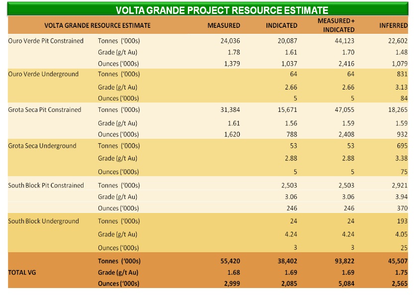Gold reserves at Volte Grande currently stand at 3.8 million contained oz. from 116 million tonnes grading 1.02 grams per tonne.