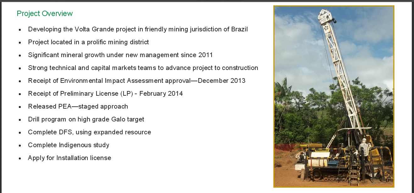Eine in Kanada gehandelte Brasilianische Open Pit Goldmine mit Flaggschiffprojekt in Volta Grande, noch im Werden, ein riesiges Gelände, und aktuell wird die Wirtschaftlichkeit nach oben justiert.