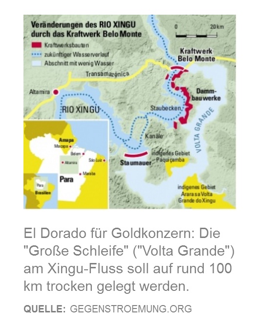 Mit dem Belo Monte-Projekt soll am Xingu-Fluss im brasilianischen Amazonasbecken der drittgrößte Staudamm der Erde realisiert werden. Für eine Kapazität von bis zu elf Gigawatt soll er eine Fläche größer als den Bodensee fluten, während der Flussabschnitt "Volta Grande" deutlich weniger Wasser erhalten wird. Die in Brasilien gegen das Staudammprojekt kämpfenden Indigenen, Flussanwohner und Umweltgruppen warnen seit Jahren vor der Zerstörung von Schutzgebieten und Regenwaldflächen. Zudem drohten mehr als 20.000 Menschen die Zwangsumsiedlung, über 40.000 Personen gelten als betroffen.