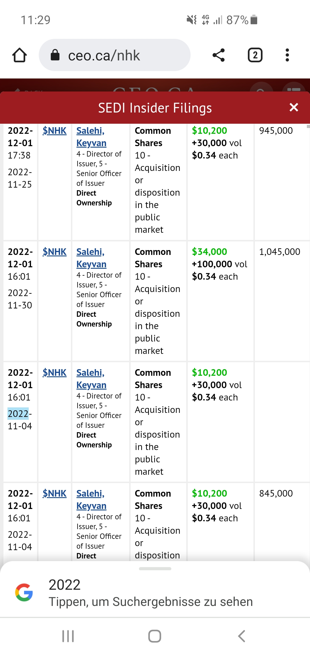 Wir haben jetzt einen Aufwärtsimpuls, hervorragende BE (https://nighthawkgold.com/investors/) und neben Cudney kauft auch der Firmenchef aktuell Aktien im freien Markt ein.