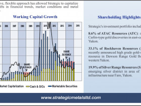 Strategic Metals is a project generator in the Yukon. Their stock price rose 500% in 2010, and peaked at $4.34 per share in 2011, but has since crashed (along with many gold and silver mining stocks). At today's .24 cent price ($23 million fully diluted), I think it is a steal and a slam dunk 5 bagger. They own 130 properties and have 12 NSRs. Plus, they own 50+ million shares (valued at $14 million), including 8% of ATAC Resources, 20% of the 40 million oz. Silver Range project, and 33% of Klaza gold disovery (Rockhaven Gold). Plus, they own the 300,000 acre Midas Touch gold property, located near the ATAC discoveries. And they have $30 million in cash.