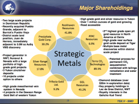 Strategic Metals is a project generator in the Yukon. Their stock price rose 500% in 2010, and peaked at $4.34 per share in 2011, but has since crashed (along with many gold and silver mining stocks). At today's .24 cent price ($23 million fully diluted), I think it is a steal and a slam dunk 5 bagger. They own 130 properties and have 12 NSRs. Plus, they own 50+ million shares (valued at $14 million), including 8% of ATAC Resources, 20% of the 40 million oz. Silver Range project, and 33% of Klaza gold disovery (Rockhaven Gold). Plus, they own the 300,000 acre Midas Touch gold property, located near the ATAC discoveries. And they have $30 million in cash.
