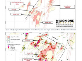 im Anhang."Following the discovery of a new mineralised lode from benching that returned a (non-representative) select sample of 502 g/t gold over .70 m (see new release dated March 5, 2018), Lion One’s Fijiexploration team has mapped more than 20 previously undefined mineralized structures at the Jomaki-Ura Creek prospect areas and identified potential geological extensions on the main mineralized zones inside the Tuvatu Mining Lease (SML 62) ....