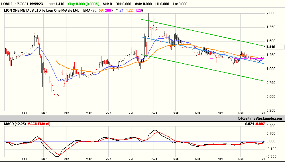 Lio hält sich gut, der grosse Anstieg scheint, so sieht es im Augenblick aus, mit einer Seitwärtskonsolidierung verdaut zu werden. Der 9 MA schreitet von unten schön heran. Mögliche Strategie für Käufe: 1/2 jetzt um 1.75, falls unter 1.60 die andere Hälfte. Der Chart gefällt mir, aber auch andere Minen dürften abgehen, falls/wenn es Lio tut... bei einem gewaltigen Bullenmarkt steigt eh alles.....