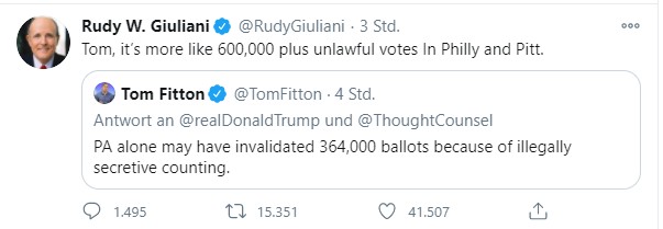 • Rudy Giuliani twittert, alleine in 2 Städten in Pennsylvania wären an 600.000 Stimmen falsch (gezählt).