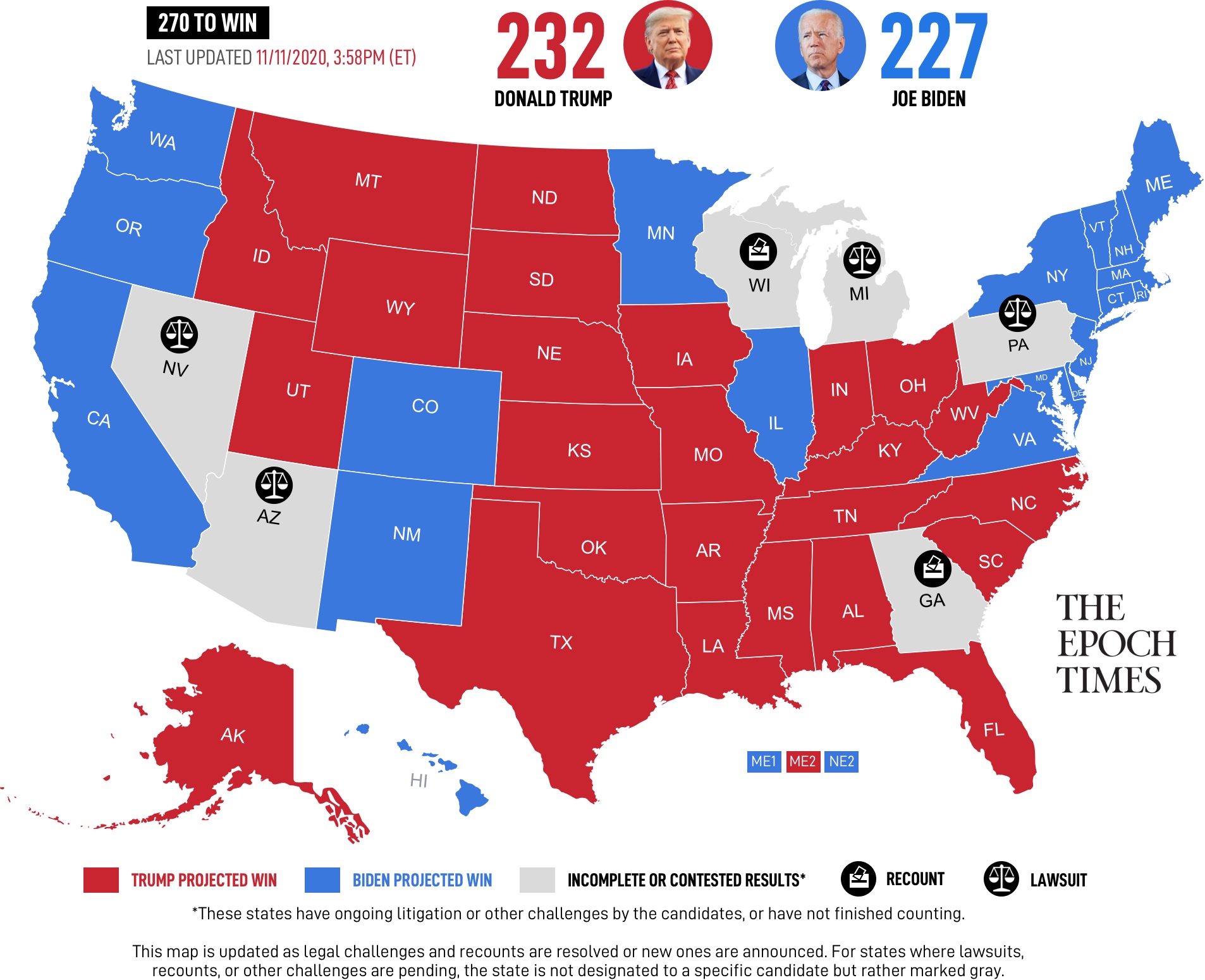 Trump gewinnt North Carolina und Alaska. Die zwei Senatorenplätze gehen ebenfalls an die Republikaner. Die Republikaner stellen jetzt 50 Senatoren und damit die Hälfte. Zwei Wahlen für Senatoren stehen noch aus. Die Demokraten müssen beide gewinnen um ein Patt im Senat zu erreichen. Beide Demokraten liegen in Umfragen hinten. Die Republikaner werden sehr wahrscheinlich eine Mehrheit im Senat erreichen und können jedes Gesetz was das Haus mit Demokratenmehrheit beschließt abschmettern. Joe Biden kann dann nur Gesetze per Executive Order durchdrücken. Wird das nicht Lame Duck genannt?