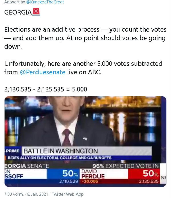 Warum stehen nur ein paar von Tausenden Landesabgeordneten in USA auf und fordern eine Überprüfung der Wahl?????????? in Ihrem Bundesstaat. Wurden sie alle durch Betrug ins Amt gehievt??? Es kann doch nicht sein dass im angeblich freiesten Staat der Erde keine Sau daran Interessiert ist eine zu 100% Korrekten Wahlauszählung zu fordern. Ausschliesslich in einer Diktatur wird das Ergebnis im Club bestimmt, wobei jegliches Gegenargument sofort beseitigt wird,falls nötig auch der Vortragende.