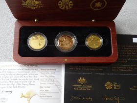 Kangaroo at Sunset 1/5 oz Proof, 1/4 oz Sovereign Proof, 1/4 oz Maple Leaf Bullion