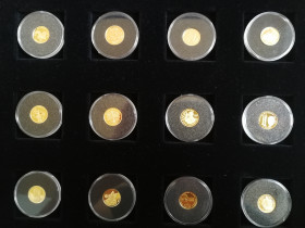 12 Münzen, gekapselt, unbetatscht, aber teils mit roten Flecken, alle 999 Feingold.
