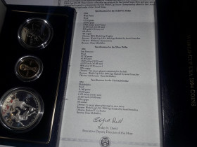 Fotografiertes Set in Topzustand unter Spot anzubieten. World Cup USA 1994 Three Coin Proof Set. 8.359 Gramm 900er Gold, dazu 26,73 Gramm 900er Silber und ein Cu Ni Half Dollar. 400 Euro inkl. DHL Paket.