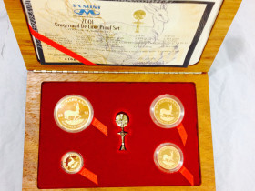 Das Set besteht aus jeweils einem Krügerrand Goldstück der Größen 1 Unze, 1/2 Unze, 1/4 Unze sowie 1/10 Unze, Au 916,67, eine Edelholzbox mit Nummerierung, sowie ein Zertifikat.