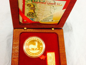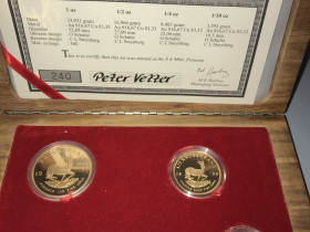 Das Set besteht aus jeweils einem Krügerrand Goldstück der Größen 1 Unze, 1/2 Unze, 1/4 Unze sowie 1/10 Unze, Au 916,67, eine Edelholzbox mit Nummerierung, sowie ein Zertifikat.