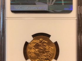 Sovereign George V von 1912, unzirkuliert/Stempelglanz, 7,98 g, Prägestätte London, 916er Gold mit 7,32 g fein. Im NGC Slab in der Erhaltung MS63 für 485 Euro inkl. Versand als DHL Paket oder Abholung (für 480 Euro) in der Region Frankfurt/Rhein-Main.Bezahlung per Überweisung oder PayPal Freunde bzw. Bar bei Abholung.