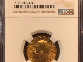 Sovereign George V von 1912, unzirkuliert/Stempelglanz, 7,98 g, Prägestätte London, 916er Gold mit 7,32 g fein. Im NGC Slab in der Erhaltung MS63 für 485 Euro inkl. Versand als DHL Paket oder Abholung (für 480 Euro) in der Region Frankfurt/Rhein-Main.Bezahlung per Überweisung oder PayPal Freunde bzw. Bar bei Abholung.