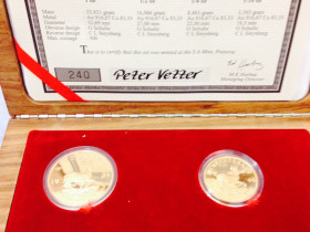 Das Set besteht aus jeweils einem Krügerrand Goldstück der Größen 1 Unze, 1/2 Unze, 1/4 Unze sowie 1/10 Unze, Au 916,67, eine Edelholzbox mit Nummerierung, sowie ein Zertifikat.