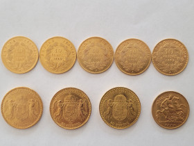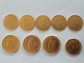 1862alles Buchstabe A (Paris) je 2,9 Gramm fein für je 175 Euro GB ½ Sovereign Edward VII 3,66 Gramm fein von 1909 für 220 EuroUngarn 20 Kronen Franz Joseph I stehend 6,09 Gramm fein von 1892 und 1893 (2x) je 365 Euro. Zwei verkauft...der linke 1893er ist noch zu haben.- Chile 50 Pesos von 1926 9,15 Gramm fein für 540 Euro