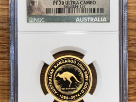 des Australian Kangaroos 2014. Sonderprägung zum 25. Jahrestag der Erstausgabe (1989) in Polierter Platte. Bei den 2014er Jubiläumsprägungen handelt es sich um die seltensten Ausgaben der gesamten Känguruserie, mit extrem kleinen Auflagen. Die Stückelungen (1/20, 1/10, 1/2 und 1/4 oz) dieses Sondermotivs wurden nur in Polierter Platte ausgegeben. Dementsprechend werden sie sehr selten angeboten und sind schwer zu bekommen. Die Gesamtauflagen der einzelnen Stücke betragen: