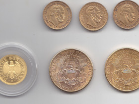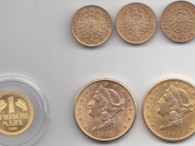 Double Eagle 20 US $ 1904 San Francisco, guter Zustand: 1110 inkl. DHL.3x 20 Mark Wilhelm I, 1872, 1875, 1887, Berlin. 2x Normaler Zustand 1x gut, siehe Fotos. Zusammen 790 inkl. DHL.1x 1DM Gold 2001 F, Top Zustand: 470 inkl. DHL