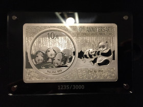 1 x 10 Yuan China Panda 30 Jahre Sonderedition 1 Unze Silber mit 2 Oz Barren im Etui