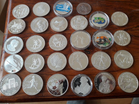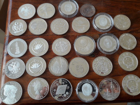 Ich biete eine bunte Mischung von 25 Silbermünzen und drei Medaillen (gepunzt) aus aller Welt. Unter anderem enthalten sind 2 x 3 Rubel, 2 x 10 Yuan, Bhutan, Nepal, Bangladesch, Seychellen...vieles aus 925er Silber und ohne Schrott. Gesamt 694 Gramm fein zum Spotpreis von 465 Euro inkl. DHL Paket.
